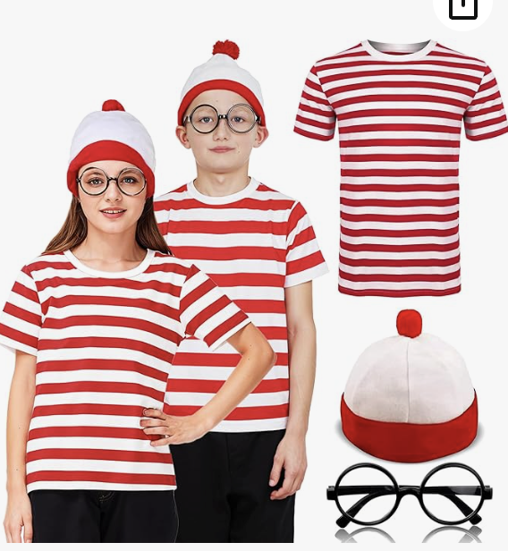 There’s a reason that this is often a theme for group dress ups – it’s super easy! Blue trousers or jeans, and a red and white stripey top. Add a red and white bobble hat and some fake glasses (or draw them on with eyeliner) and you’re good to go baby! If you haven’t already got the top, Amazon have a set with the t-shirt, glasses and hat for £8.16 right now.